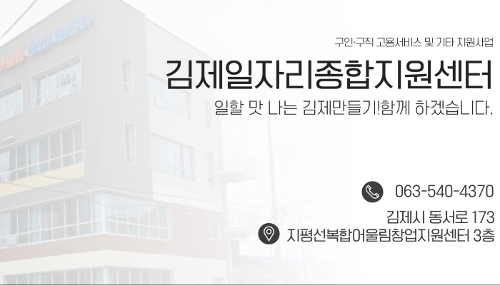 시민곁愛 든든한 일자리 허브김제일자리종합지원센터가 함께합니다. 지역산업과 고용을 연계하는 安정적 新일자리 창출을 위한 징검다리 역할을 수행합니다. 취업연계(구직) 취업연계(구인) 구인신청 구직신청 대관신청 일정안내 오시는 길 공지사항&일자리소식 일할 맛 나는 김제만들기에 김제일자리종합지원센터가 함께합니다. 공지사항 [한국산업인력공단] 2026년도 전북특별자치도 기능경기대회 26-01-12 [공고] 2025년 한국형 퀵스타트 프로그램 제3차 교육생 모집 공고 26-01-08 [김제시청] 김제시 농특산물 홍보판매장 지평선몰 기간제 근로자 채용 공고 25-12-31 [김제시청] 김제시 사회적경제 중간지원조직 기간제근로자 채용 공고 25-12-24 [공고] 2025 김제시 외국인 근로자 지역 탐방 참가자 모집(마감) 25-10-28 민간채용정보 D-8(재)김제지평선먹거리통합지원센터 기간제 근로자 모집(물류, 배송, ... D-58방문 요양보호사구인 D-30학교 청소원 구인 D-58공업기계 설치 및 정비원(냉동기 자격증 보유자) 채용 D-8(재)김제지평선먹거리통합지원센터 기간제 근로자 모집(소분,포장) 공공채용정보 마감2026년 농업기술센터 농촌지원과 농기계임대사업소 기간제근로자 채용 공고 마감2026년 자원순환과 운전직 공무원 대체인력 기간제 근로자 공개채용 공고 마감2026년 농촌지원과 지원기획팀 기간제근로자 채용 공고 마감김제시 사회적경제 중간지원조직(팀장) 채용 결과 공고 마감2026년 농촌 찾아가는 사회서비스 활성화 지원사업 직원 채용 공고 센터소식 김제일자리종합지원센터의 다양한 소식을 전해드립니다. 2026-01-26 2026년 일자리 매칭데이_1차, 농업법인회사(주)한우물 2026-01-19 [김제일자리종합지원센터 일자리정보지] 1월 넷째주 2026-01-16 2026년 김제일자리종합지원센터 지원사업 모음 2026-01-12 [김제일자리종합지원센터] 한국형 퀵스타트 프로그램_농업회사법인(주)한우물 2026-01-06 [김제일자리종합지원센터 일자리정보지] 1월 둘째주 2026-01-05 [김제일자리종합지원센터] 새해 인사 2025-12-30 [김제일자리종합지원센터 일자리정보지] 12월 다섯째주 2025-12-17 [김제일자리종합지원센터 일자리정보지] 12월 셋째주 2025-12-11 김제일자리종합지원센터-김제시농어촌종합지원센터 업무협약식 2025-12-04 2025 김제시 외국인 일자리포럼 자료가 없습니다.