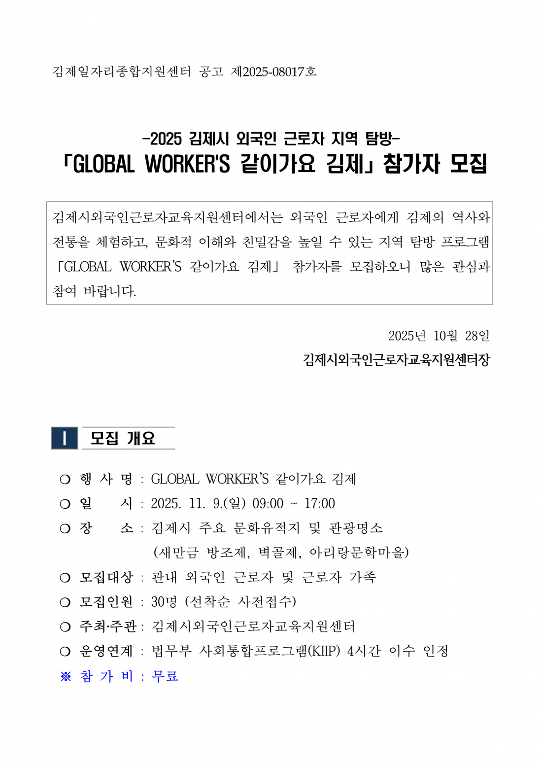 [공고] 2025 김제시 외국인 근로자 지역 탐방 참가자 모집 관리자2025-10-28조회 38 첨부파일 (공고문) 2025 김제시 외국인 근로자 지역 탐방 참가자 모집.pdf (104.7 KB) (신청서) 2025 김제시 외국인 근로자 지역 탐방 참가자 모집.hwpx (41.6 KB) 목록보기 이전글 [공고] 2025년 한국형 퀵스타트 프로그램 농업회사법인(주)한우물 채용연계형 인턴 교육생 2차 모집 공고 다음글 다음글이 없습니다.