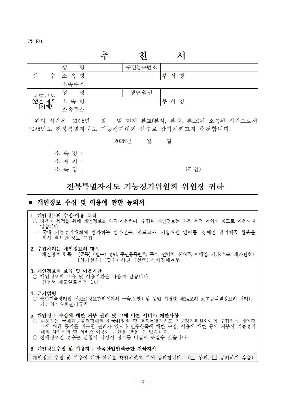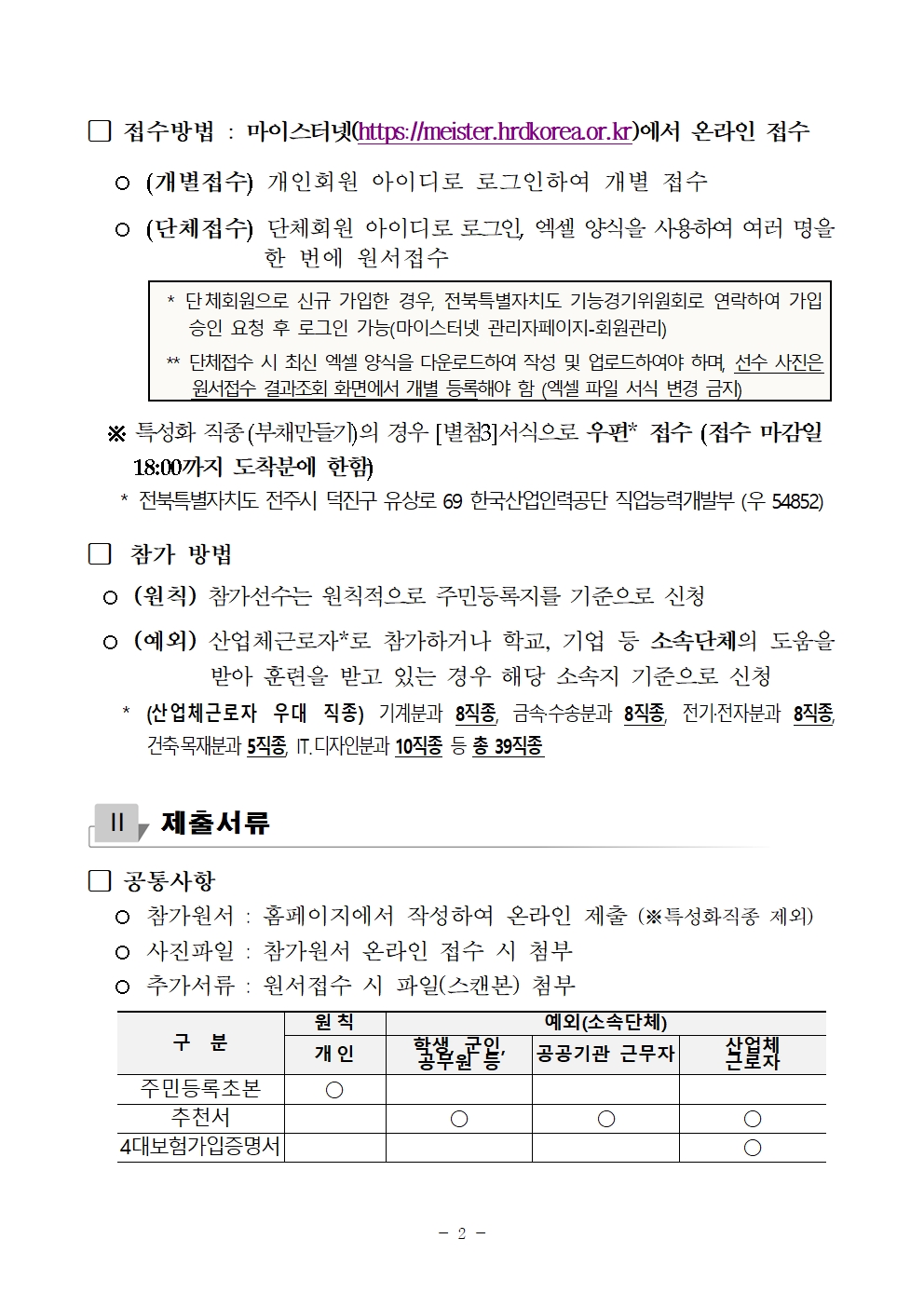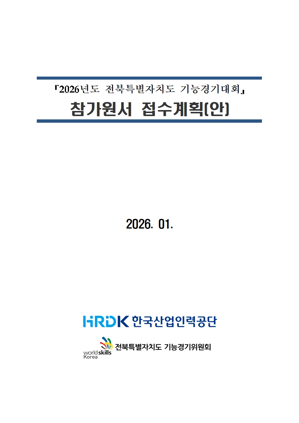 [한국산업인력공단] 2026년도 전북특별자치도 기능경기대회 관리자2026-01-12조회 39 첨부파일 2026년도 전북특별자치도 기능경기대회 참가원서 접수안내.hwp (196.0 KB) 2026년도 지방기능경기대회 개최 공고문.pdf (2.8 MB) 목록보기 이전글 [김제시청] 김제시 농특산물 홍보판매장 지평선몰 기간제 근로자 채용 공고 다음글 [공고] 2025년 한국형 퀵스타트 프로그램 제3차 교육생 모집 공고