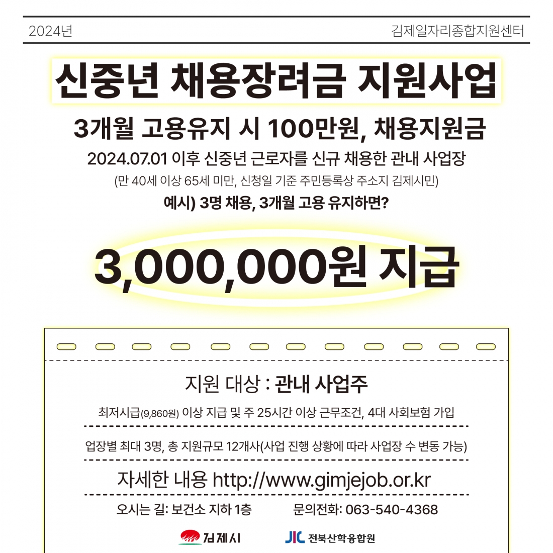 2024년 신중년 채용장려금 지원사업 관리자2024-12-05조회 398 목록보기 이전글 2024 김제시 일자리포럼 개최 다음글 [김제일자리종합지원센터 일자리정보지] 2024년 12월 15일 제 034호