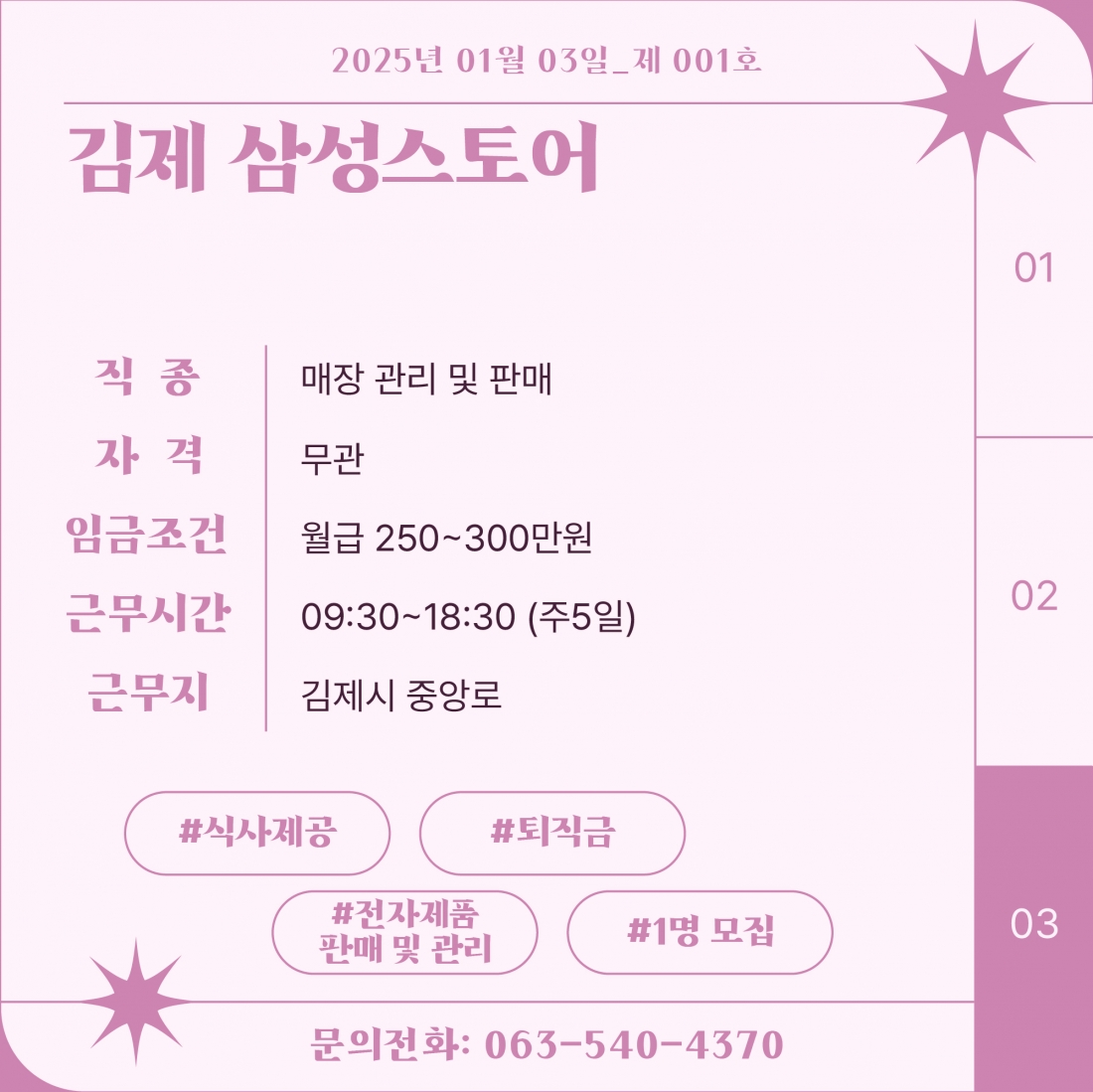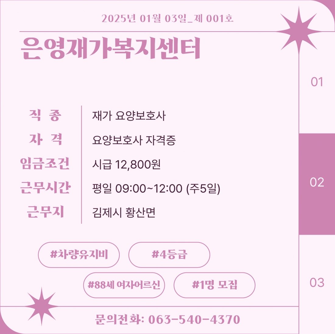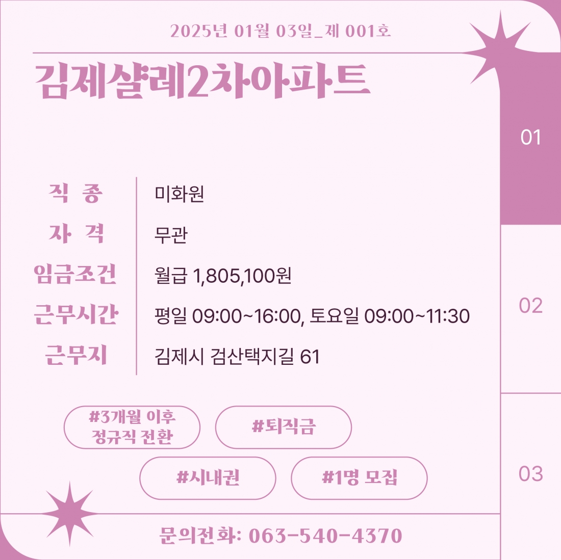 [김제일자리종합지원센터 일자리정보지] 2025년 01월 03일 제 001호 관리자2025-01-03조회 415 목록보기 이전글 [김제일자리종합지원센터 일자리정보지] 2025년 새해 인사 다음글 202년 신중년 취업지원사업