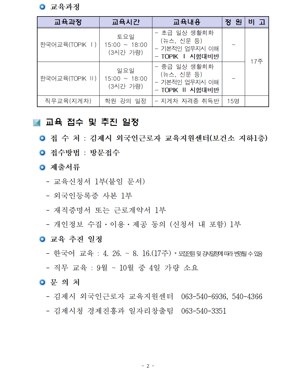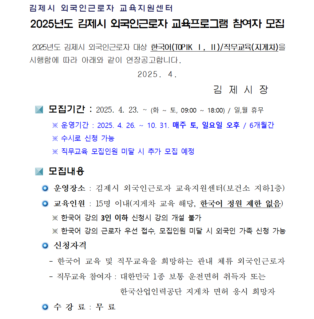 [연장공고] 2025년 김제시 외국인근로자 교육지원 프로그램 참여자 모집(마감) 관리자2025-04-23조회 391 첨부파일 3. 연장공고문_2025년 외국인근로자 교육지원 프로그램_2.hwp (65.0 KB) 2. 신청서_2025년 외국인근로자 교육지원 프로그램_4.hwp (50.0 KB) 목록보기 이전글 [수정공고] 2025년 신중년 브릿지프로젝트 마케팅 지원사업 공고(마감) 다음글 [공고] 2025년 김제형 신중년 리스타트 지원사업_신규 취업자 인센티브 지원 참여자 모집(마감)