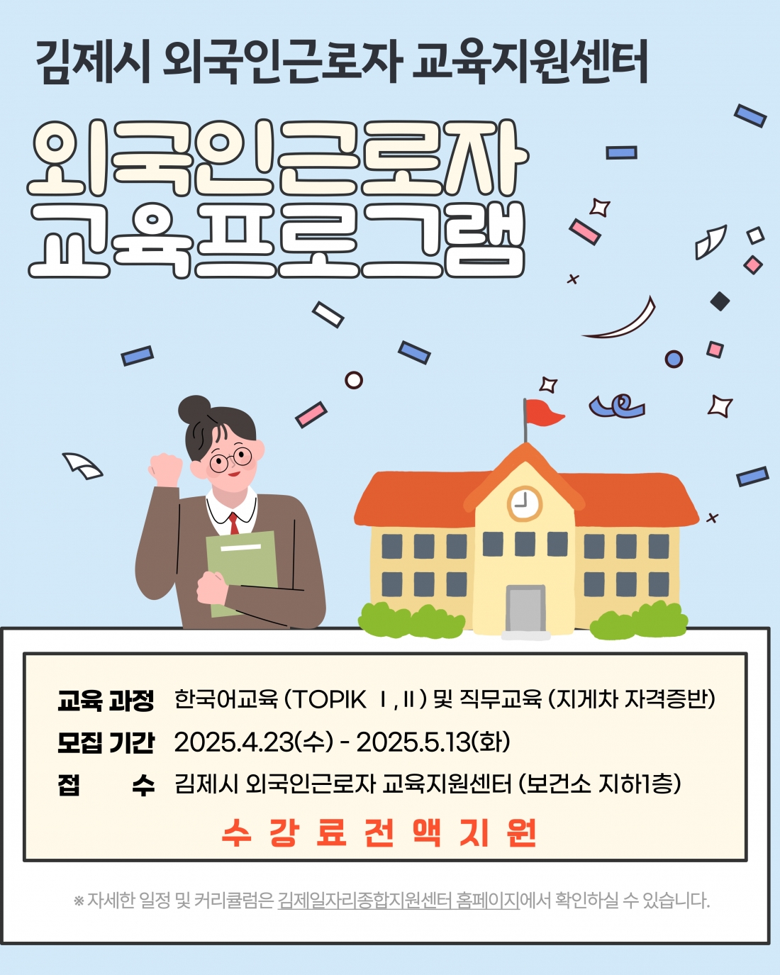 2025 김제시외국인근로자교육지원센터 교육프로그램 참여자 모집 관리자2025-05-03조회 349 목록보기 이전글 [김제일자리종합지원센터 일자리정보지] 2025년 05월 02일 제 009호 다음글 [김제일자리종합지원센터 일자리정보지] 2025년 05월 07일 제 010호