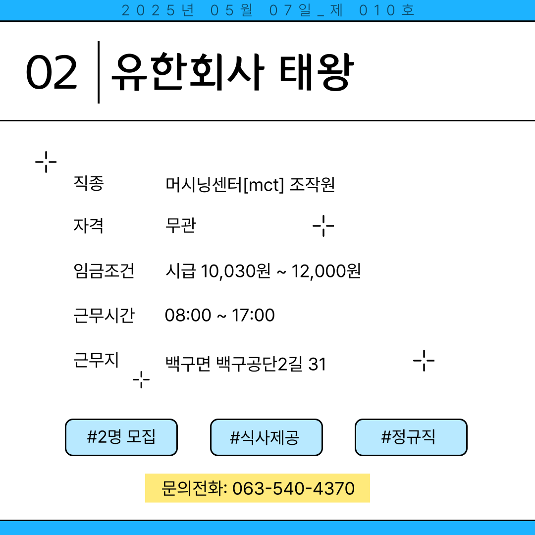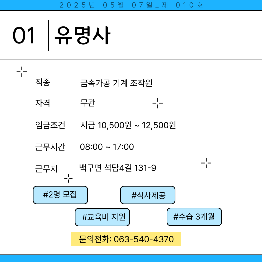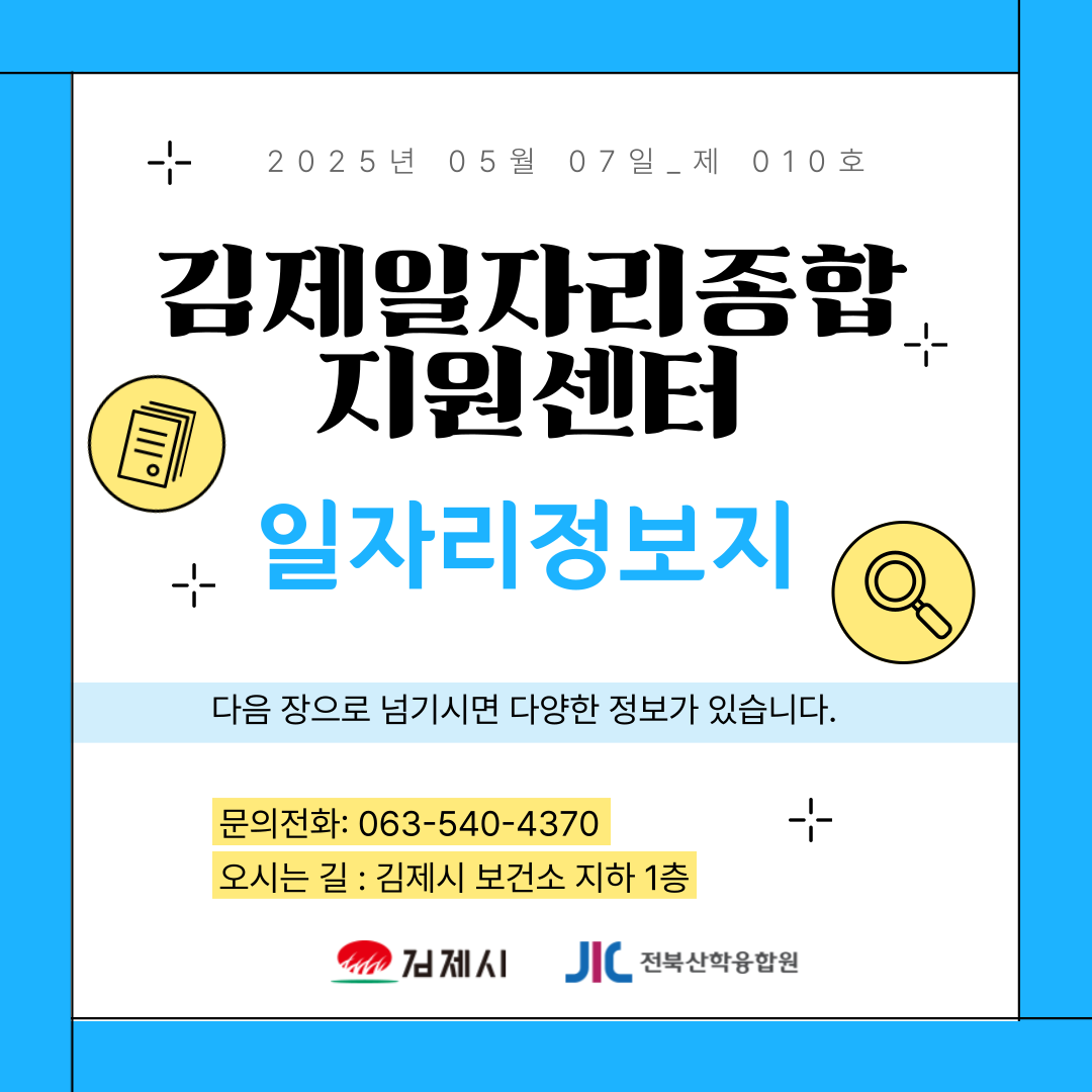 [김제일자리종합지원센터 일자리정보지] 2025년 05월 07일 제 010호 관리자2025-05-07조회 372 목록보기 이전글 2025 김제시외국인근로자교육지원센터 교육프로그램 참여자 모집 다음글 [김제일자리종합지원센터 일자리정보지] 2025년 05월 08일 제 011호