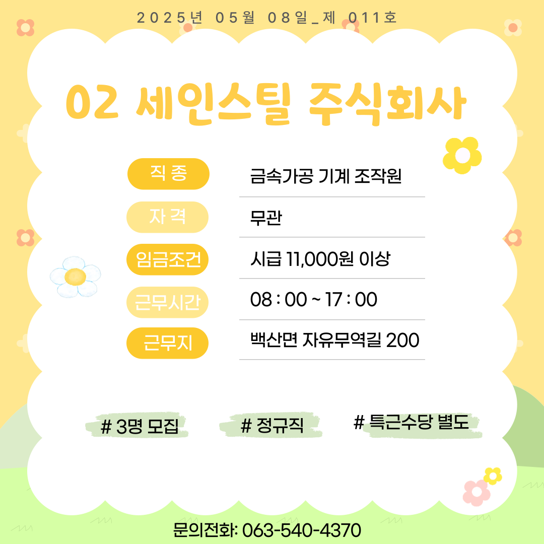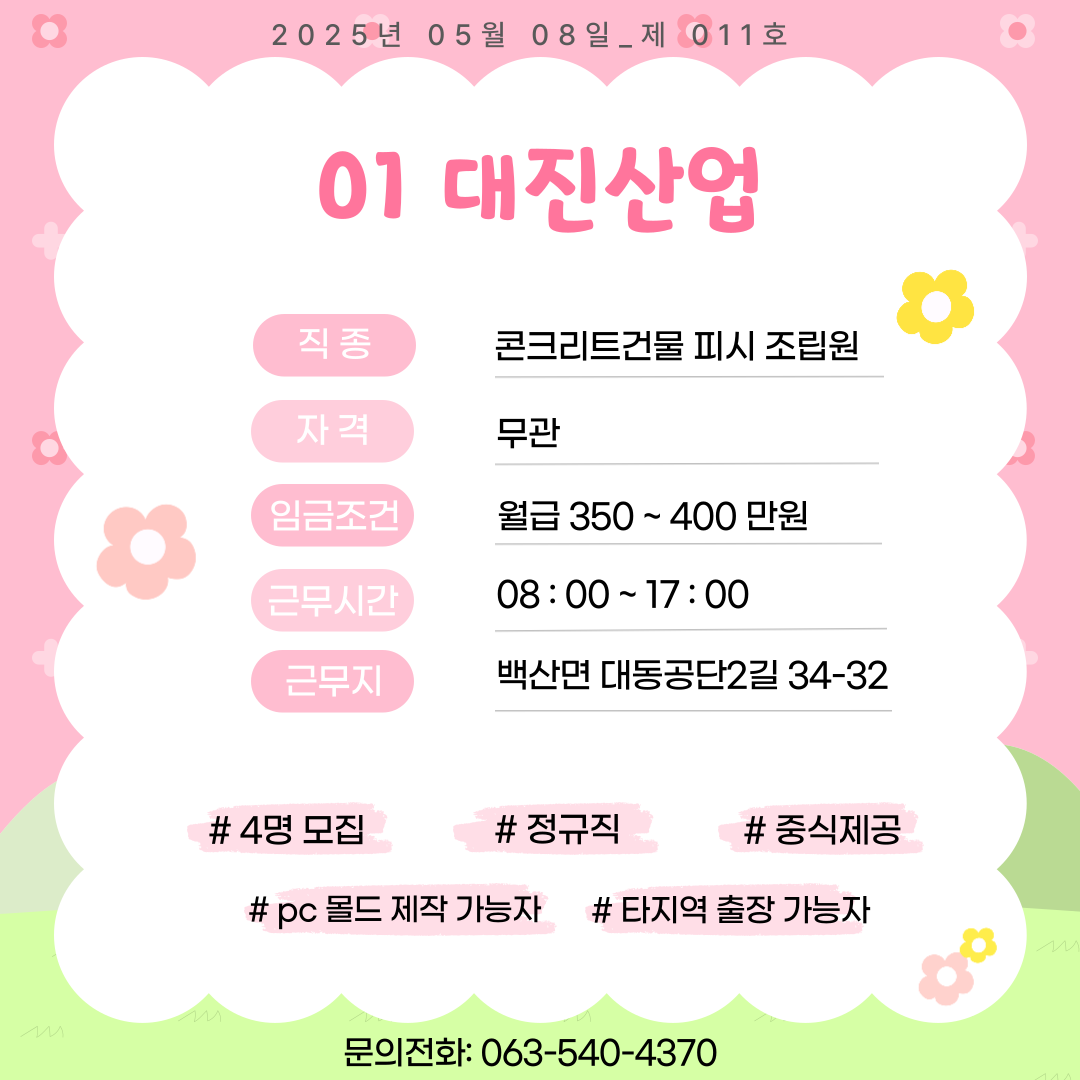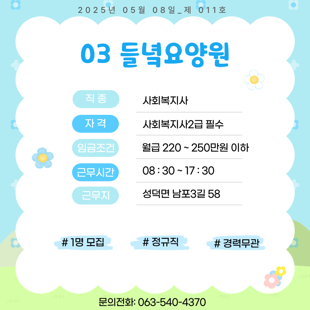 [김제일자리종합지원센터 일자리정보지] 2025년 05월 08일 제 011호 관리자2025-05-08조회 351 목록보기 이전글 [김제일자리종합지원센터 일자리정보지] 2025년 05월 07일 제 010호 다음글 [김제일자리종합지원센터 일자리정보지] 2025년 05월 12일 제 012호
