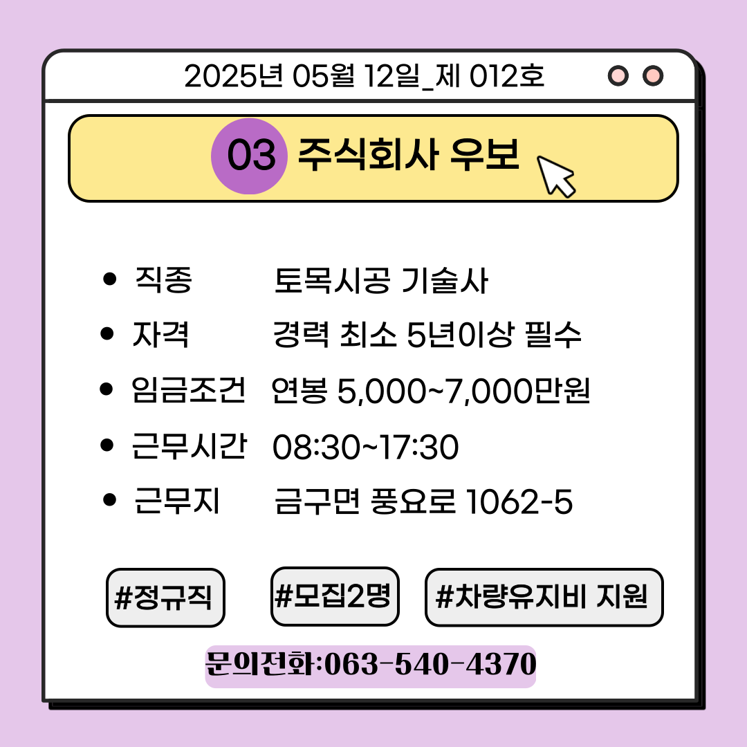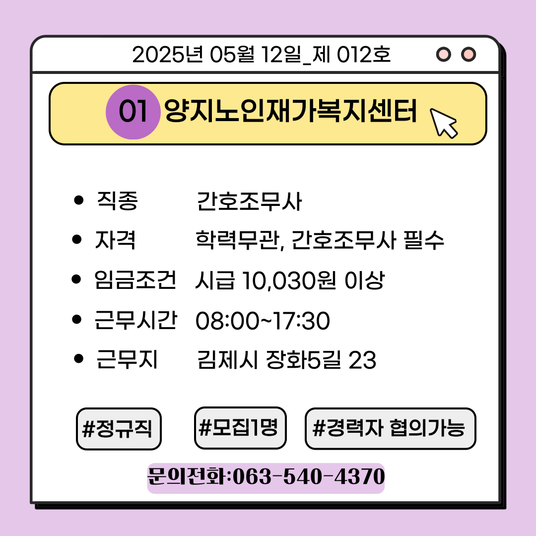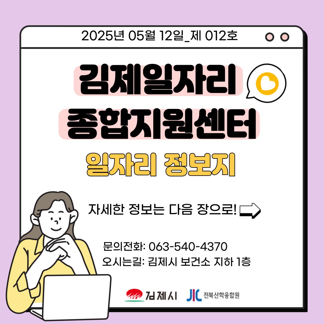 [김제일자리종합지원센터 일자리정보지] 2025년 05월 12일 제 012호 관리자2025-05-12조회 331 목록보기 이전글 [김제일자리종합지원센터 일자리정보지] 2025년 05월 08일 제 011호 다음글 2025. 5 일자리매칭데이(한우물)