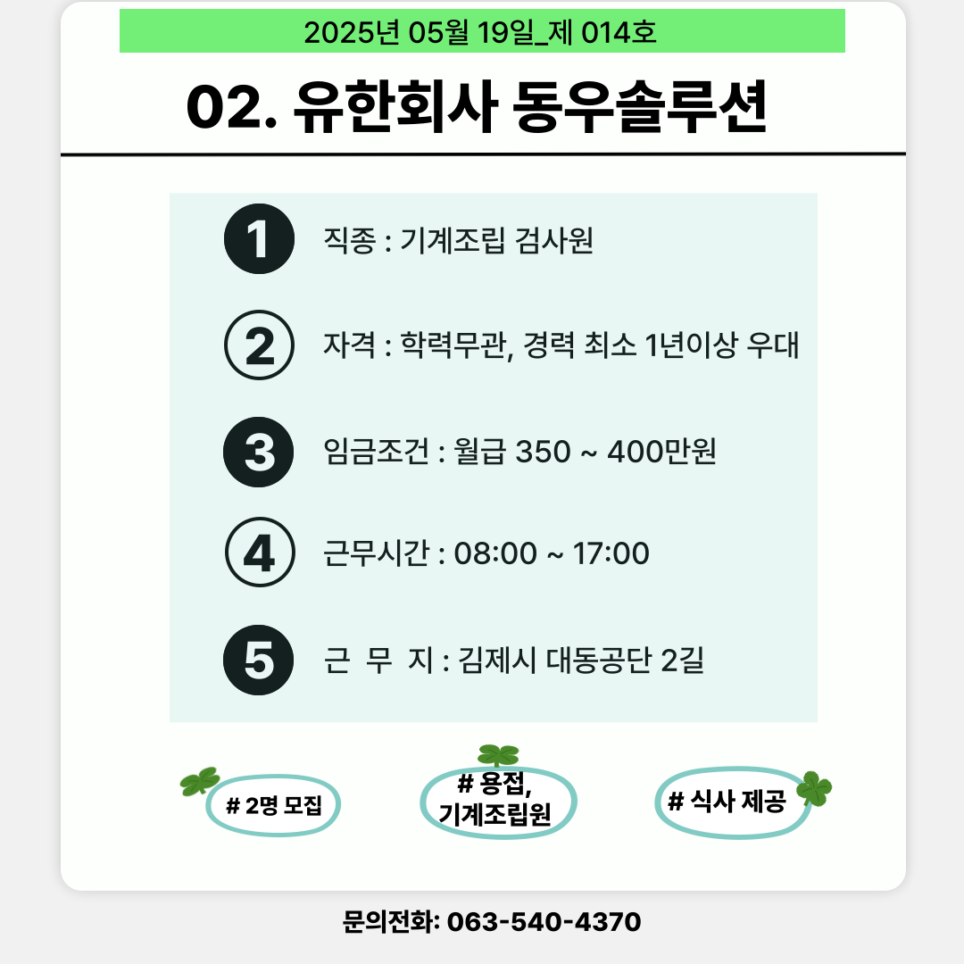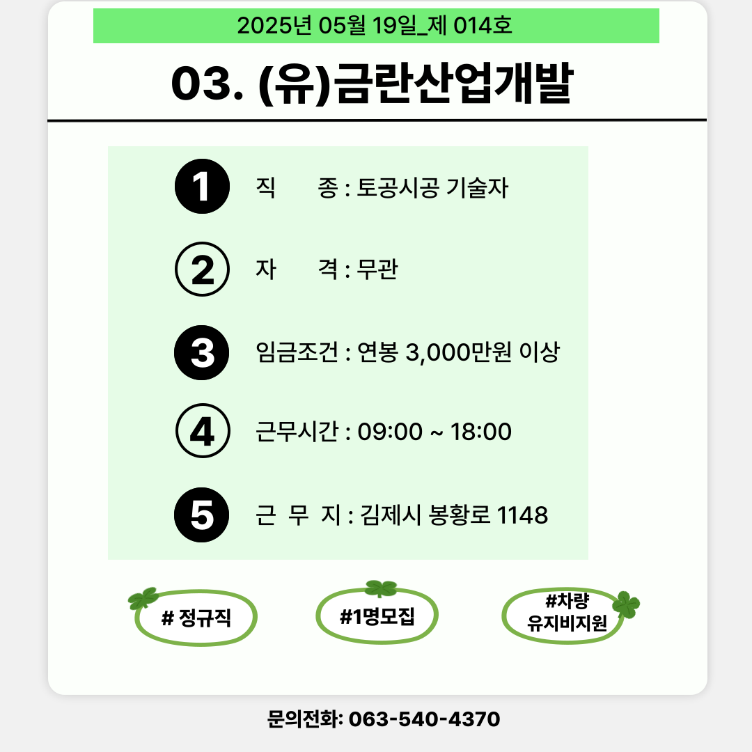 [김제일자리종합지원센터 일자리정보지] 2025년 5월 19일 제 014호 관리자2025-05-19조회 344 목록보기 이전글 2025. 5 양산외국인근로자지원센터 벤치마킹 다음글 [김제일자리종합지원센터 일자리정보지] 2025년 5월 26일 제 016호