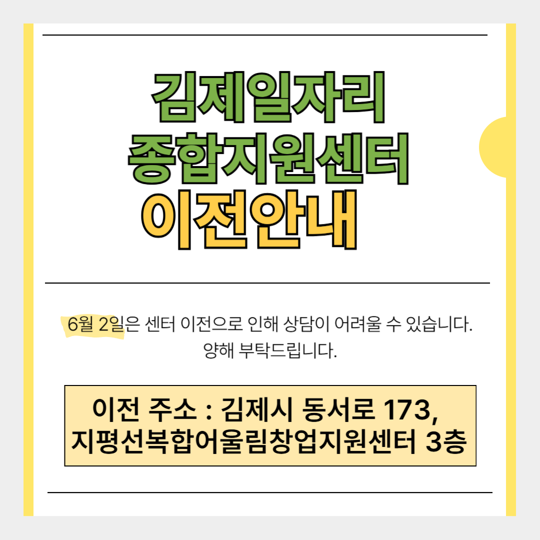 [김제일자리종합지원센터 일자리정보지] 센터 이전 관리자2025-05-28조회 305 목록보기 이전글 [김제고용복지플러스센터] 고용복지플러스센터로 똑똑! 다음글 2025 직업교육 프로그램_일반경비원 신임교육과정
