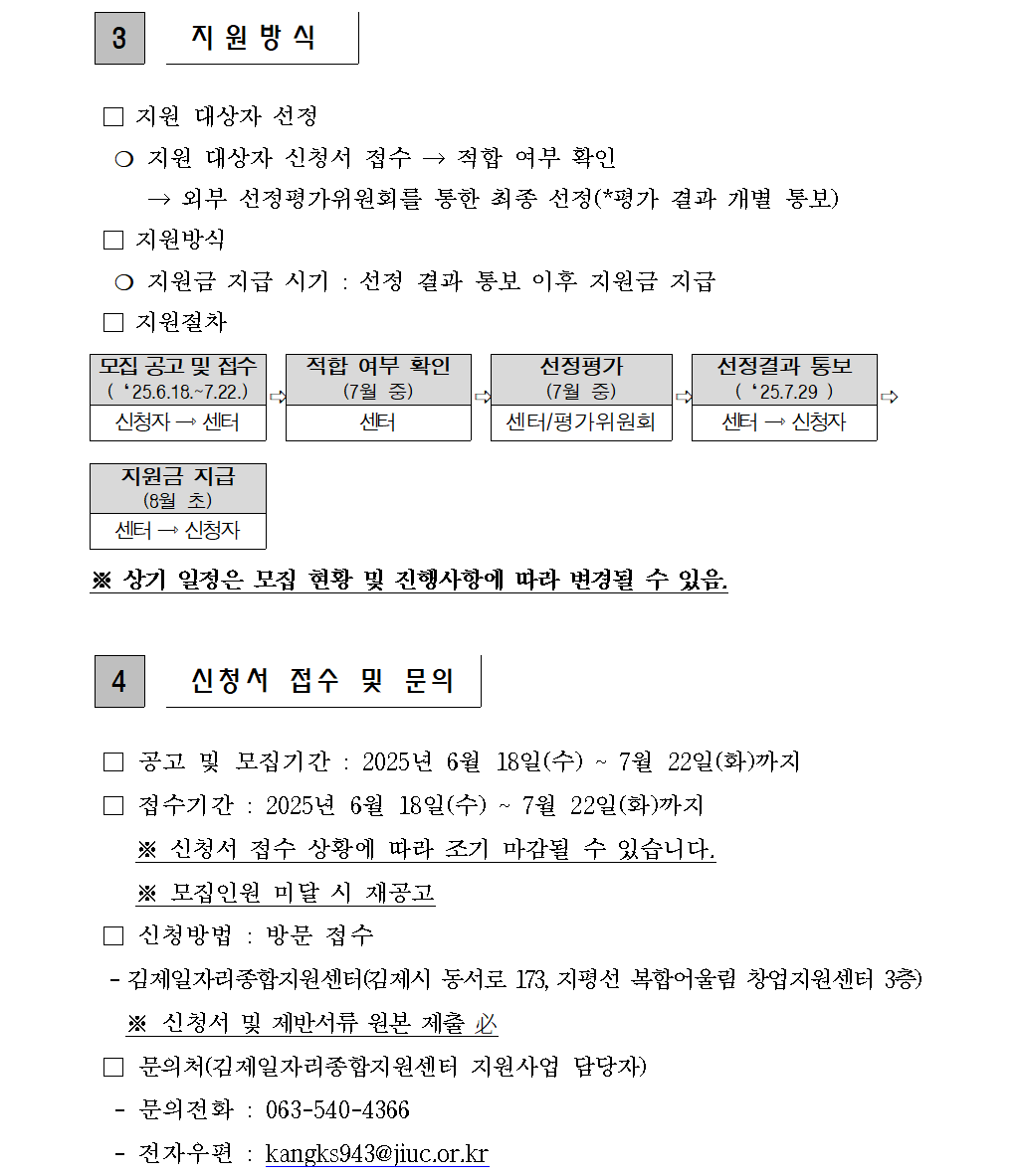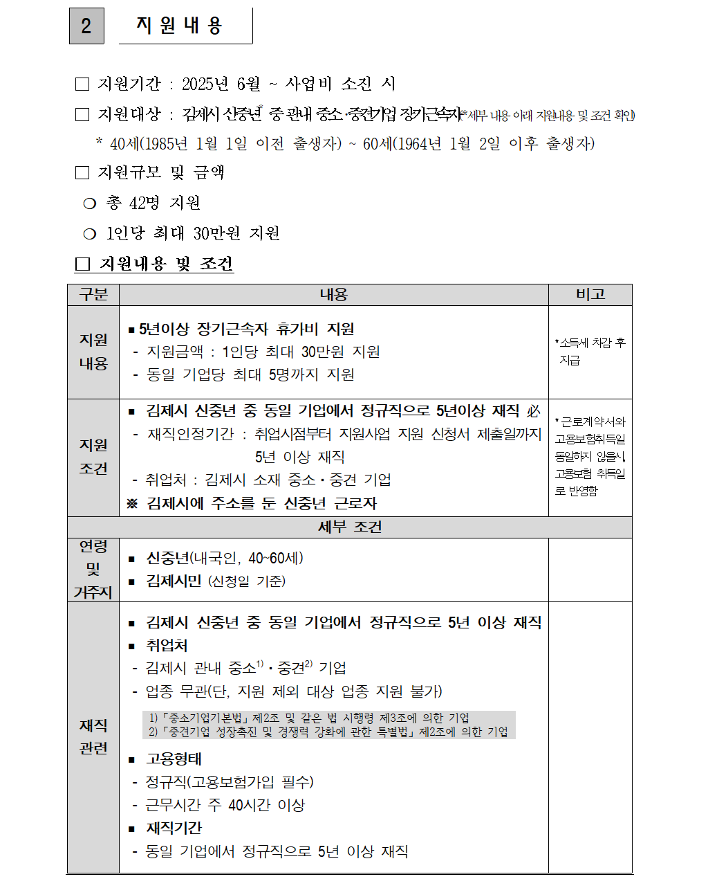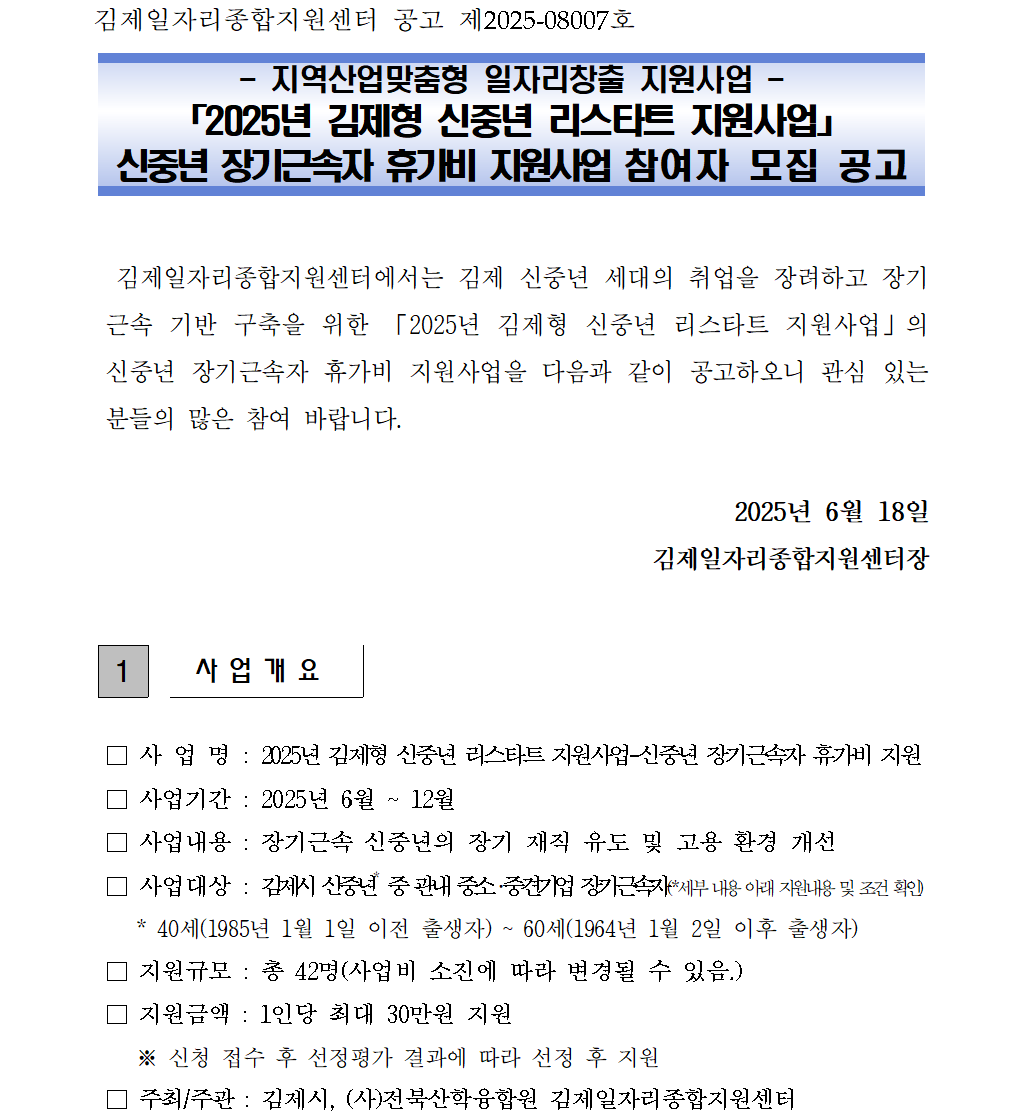 [수정공고] 2025년 김제형 신중년 리스타트 지원사업_장기근속자 휴가비 지원 참여자 모집(마감) 관리자2025-06-18조회 543 첨부파일 1. 공고문_2025년 김제시 신중년 리스타트 지원사업_장기근속자_3.hwp (88.5 KB) 2. 신청서_2025년 김제시 신중년 리스타트 지원사업_장기근속자.hwpx (45.1 KB) 목록보기 이전글 [공고] 2025 직업교육프로그램_일반경비원 신임교육과정 교육생 모집(마감) 다음글 [재공고] 2025년 김제형 신중년 리스타트 지원사업_신규 취업자 인센티브 지원 참여자 모집 재공고(마감)