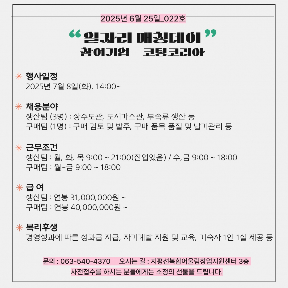 [김제일자리종합지원센터 일자리정보지] 2025년 6월 25일 제 022호 관리자2025-06-25조회 316 목록보기 이전글 [김제일자리종합지원센터 일자리정보지] 2025년 6월 23일 제 021호 다음글 [김제일자리종합지원센터 일자리정보지] 2025년 6월 27일 제 023호