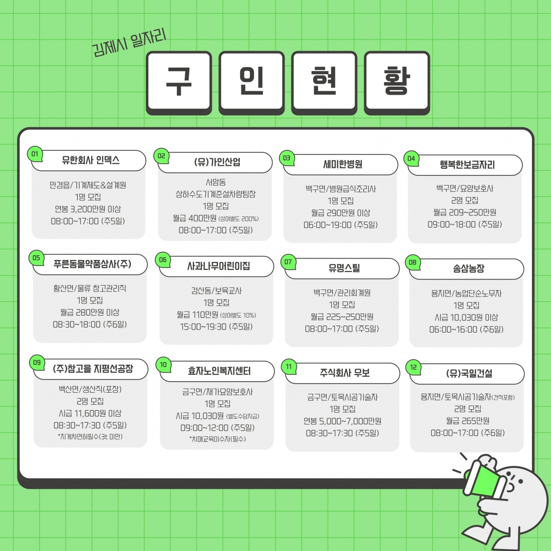 [김제일자리종합지원센터 일자리정보지] 2025년 7월 18일 제 026호 관리자2025-07-18조회 269 목록보기 이전글 [김제일자리종합지원센터 일자리정보지] 2025년 7월 16일 제 025호 다음글 2025. 7 김제일자리종합지원센터 이전 개소, 커피차 이벤트