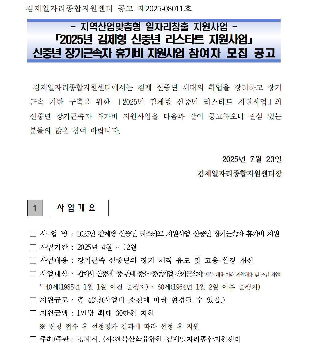[수정공고] 2025년 김제형 신중년 리스타트 지원사업_장기근속자 휴가비 지원 참여자 모집(마감) 관리자2025-07-23조회 387 첨부파일 1. 2차 공고_2025년 김제시 신중년 리스타트 지원사업_장기근속자_2.hwp (88.0 KB) 2. 신청서_2025년 김제시 신중년 리스타트 지원사업_장기근속자.hwpx (45.1 KB) 목록보기 이전글 [재공고] 2025년 김제형 신중년 리스타트 지원사업_신규 취업자 인센티브 지원 참여자 모집 재공고(마감) 다음글 [수정공고] 2025년 김제형 신중년 리스타트 지원사업_신규 취업자 인센티브 지원 참여자 모집 3차 공고(마감)
