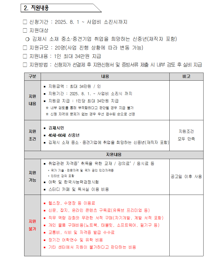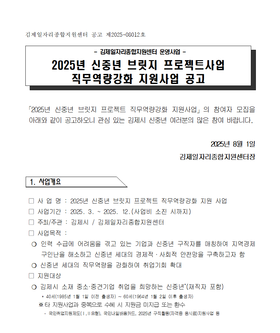 [공고] 2025년 신중년 브릿지프로젝트 직무역량강화 지원사업 공고(마감) 관리자2025-08-01조회 686 첨부파일 공고문_2025년 김제시 신중년 브릿지 프로젝트_역량강화교육_v6.hwpx (75.4 KB) 신청서_2025년 김제시 신중년 브릿지 프로젝트_역량강화교육.hwpx (47.5 KB) 목록보기 이전글 [수정공고] 2025년 김제형 신중년 리스타트 지원사업_신규 취업자 인센티브 지원 참여자 모집 3차 공고(마감) 다음글 2025 직업교육 프로그램_AI 활용 실무교육 교육생 모집(마감)
