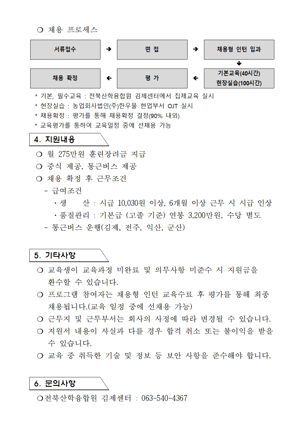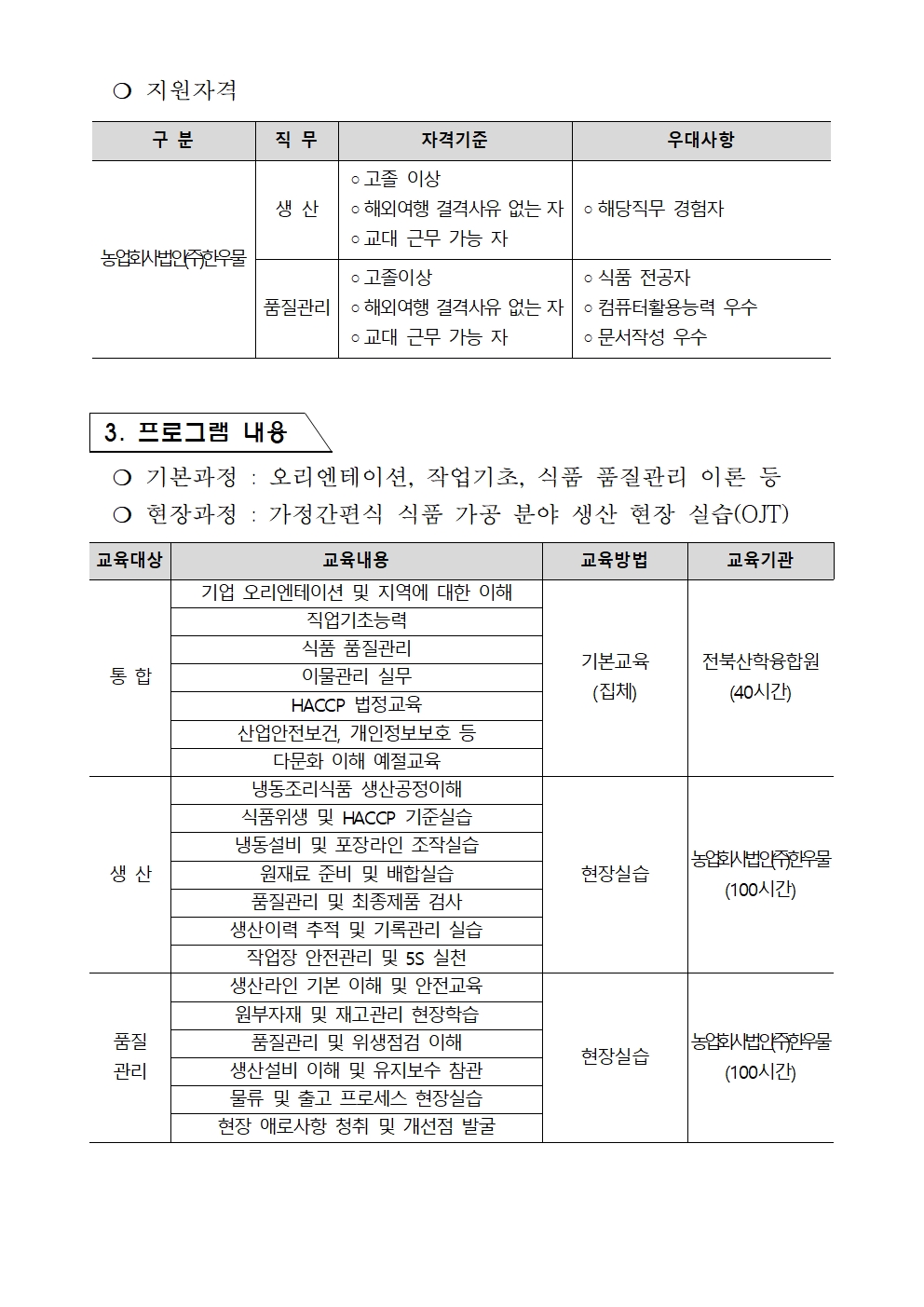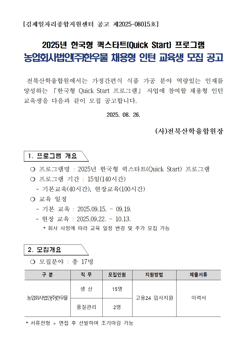 [공고] 2025년 한국형 퀵스타트 프로그램 농업회사법인(주)한우물 채용연계형 인턴 교육생 모집 공고(마감) 관리자2025-08-26조회 500 첨부파일 2023년 한국형 퀵스타트 프로그램 모집 공고_홈페이지 보완.hwp (123.5 KB) 개인정보 동의 및 사업 참여 동의서.hwp (74.5 KB) 목록보기 이전글 2025 직업교육 프로그램_AI 활용 실무교육 교육생 모집(마감) 다음글 [공고] 2025년 김제시 외국인 근로자 지원 문화행사 운영부스 모집 공고(마감)