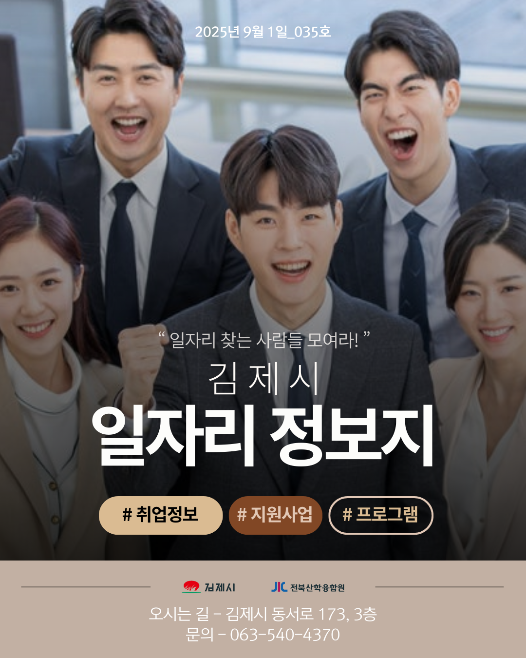 [김제일자리종합지원센터 일자리정보지] 2025년 9월 1일 제 035호 관리자2025-09-01조회 264 목록보기 이전글 2025. 8 직업교육 프로그램 운영(AI 활용 실무교육) 다음글 2025년 한국형 퀵스타트 프로그램 교육생 모집
