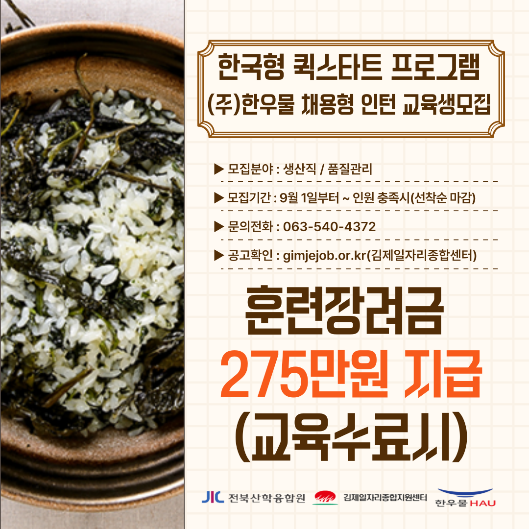 2025년 한국형 퀵스타트 프로그램 교육생 모집 관리자2025-09-04조회 240 목록보기 이전글 [김제일자리종합지원센터 일자리정보지] 2025년 9월 1일 제 035호 다음글 전북특별자치도 건설업 고용둔화대응지원사업