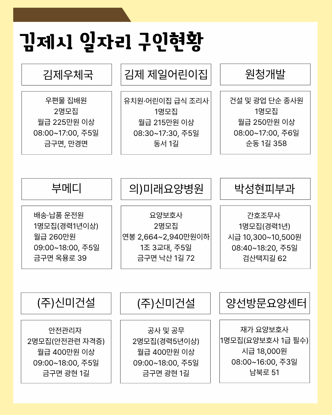 [김제일자리종합지원센터 일자리정보지] 2025년 11월 18일 제 048호 관리자2025-11-18조회 114 목록보기 이전글 [김제중앙시장 상인회] 김제중앙시장 달빛장터 다음글 [전북외국인근로자지원센터] 남원여행 참여자 모집
