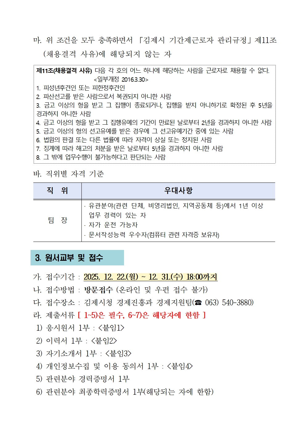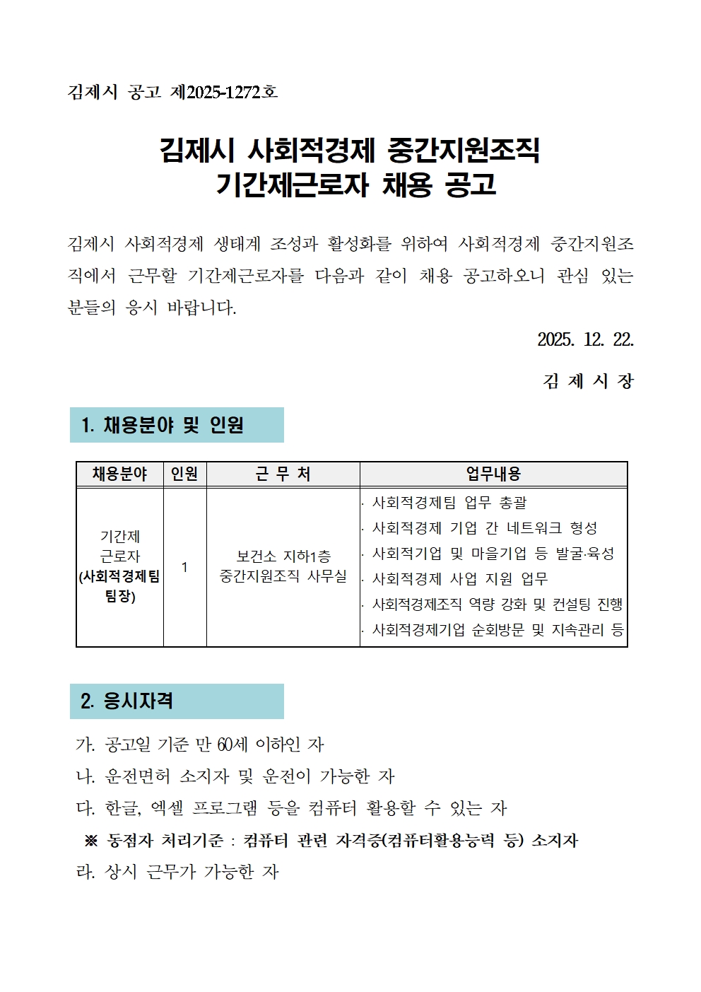 [김제시청] 김제시 사회적경제 중간지원조직 기간제근로자 채용 공고 관리자2025-12-24조회 109 [김제시청] 김제시 사회적경제 중간지원조직 기간제근로자 채용 공고 첨부파일 (팀장)사회적경제 중간지원조직 기간제근로자 채용 공고문.hwpx (76.4 KB) 목록보기 이전글 [공고] 2025 김제시 외국인 근로자 지역 탐방 참가자 모집(마감) 다음글 [김제시청] 김제시 농특산물 홍보판매장 지평선몰 기간제 근로자 채용 공고