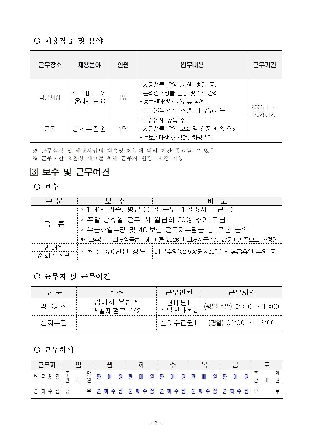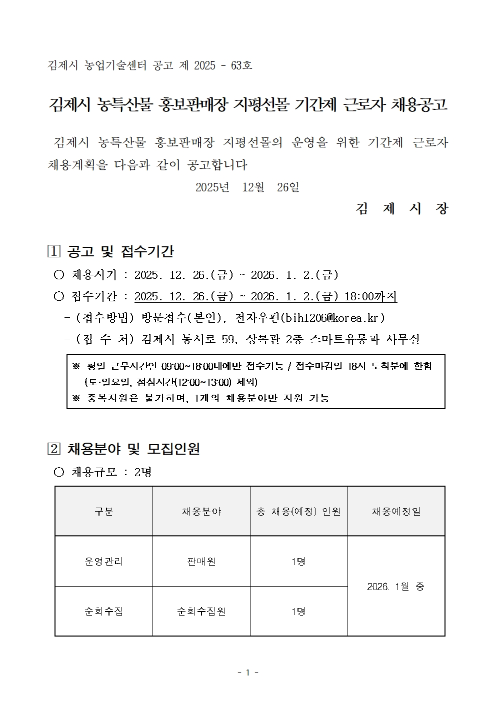 [김제시청] 김제시 농특산물 홍보판매장 지평선몰 기간제 근로자 채용 공고 관리자2025-12-31조회 89 첨부파일 2026년농특산물홍보판매장지평선몰기간제근로자채용공고.hwpx (80.2 KB) 목록보기 이전글 [김제시청] 김제시 사회적경제 중간지원조직 기간제근로자 채용 공고 다음글 [공고] 2025년 한국형 퀵스타트 프로그램 제3차 교육생 모집 공고