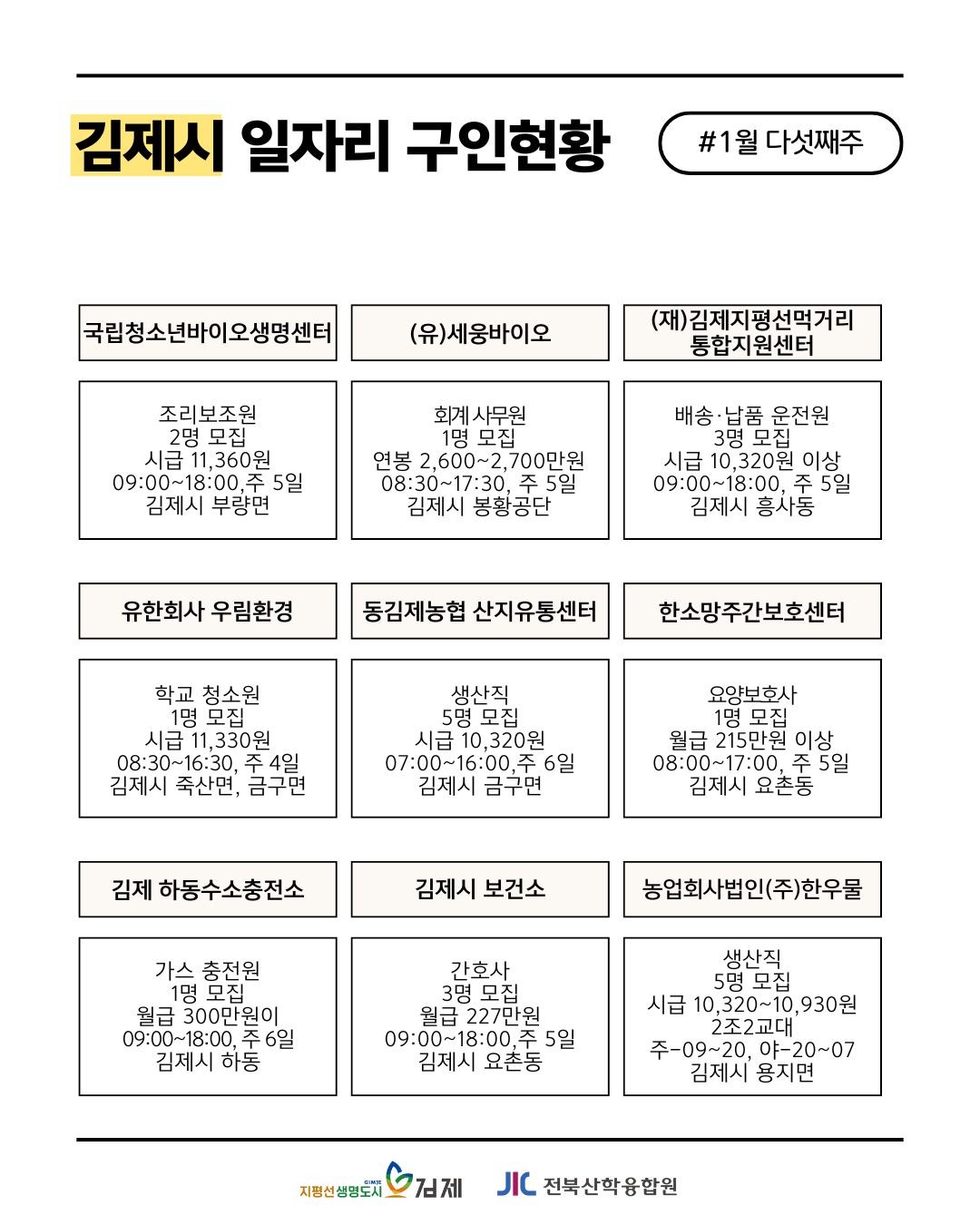 [김제일자리종합지원센터 일자리정보지] 1월 다섯째주 관리자2026-01-29조회 6 목록보기 이전글 2026년 일자리 매칭데이_1차, 농업법인회사(주)한우물 다음글 다음글이 없습니다.